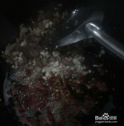 保持小火,倒入辣椒段,把辣椒炒香