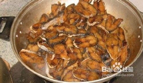 炸鱼。 在油中炸呈金黄色。捞出。(炸到没有水分,便于后面吸透汤汁)