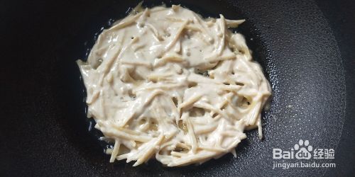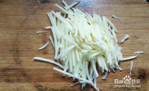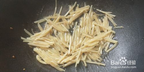 将土豆洗净去皮,刨成土豆丝。在油锅中加点水,炒熟。