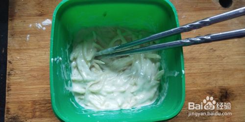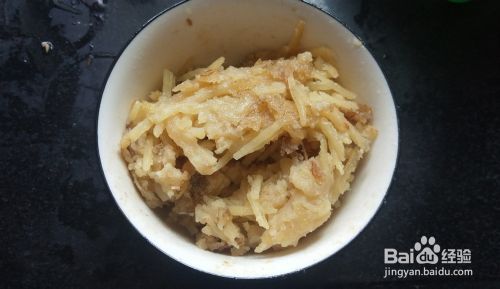 60g面粉倒入水中,搅拌调成较粘稠的面糊。倒入土豆丝,撒入适量盐 ,充分搅拌。