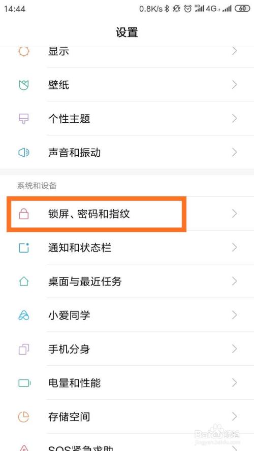 然后,沿着图中箭头方向滑动屏幕,找到锁屏、密码和指纹选项,点击打开。