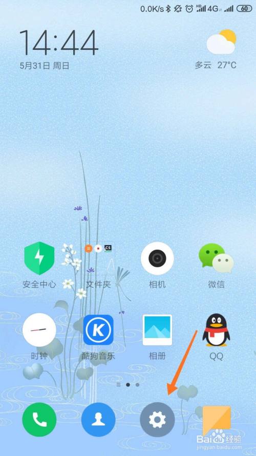 首先,打开小米手机,点击图中箭头所示的设置选项。