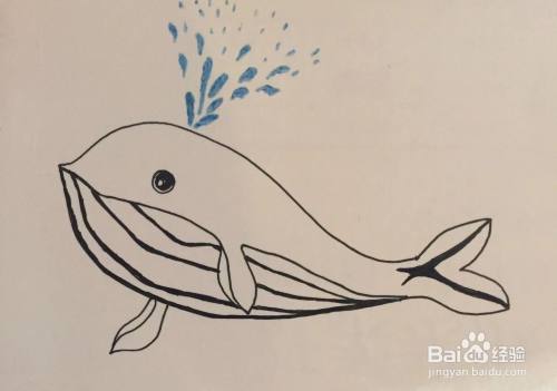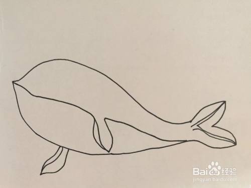 首先在纸上,用黑色勾线笔画出鲸鱼的身体轮廓。我们用笔画出鲸鱼的鱼鳍和鱼尾。