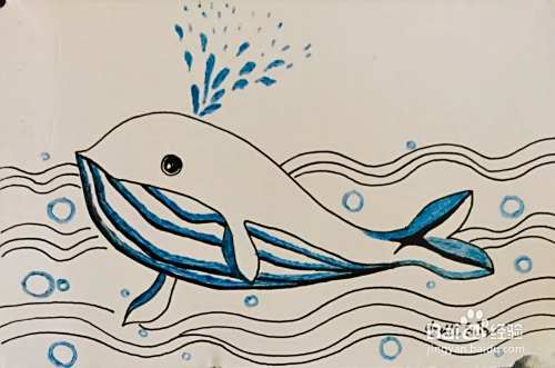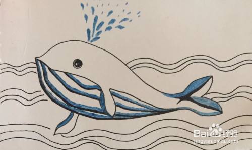 黑色勾线笔加粗这些线条,蓝色闪光笔画出鲸鱼头顶喷出的水柱。用笔为鱼尾局部上色。