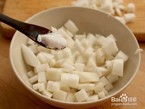 第二日将腌出的水倒掉,这样可去除一些萝卜的臭味。