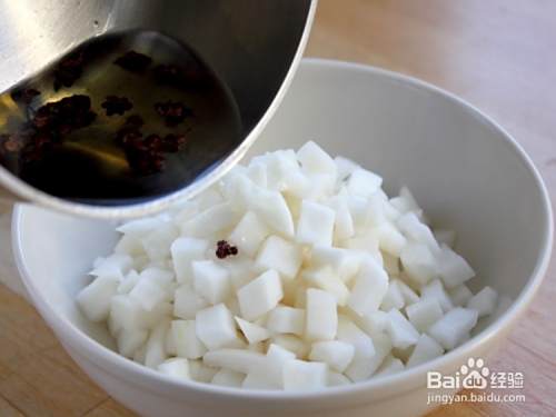 将花椒油浇到萝卜粒上,萝卜咸菜就做好了。