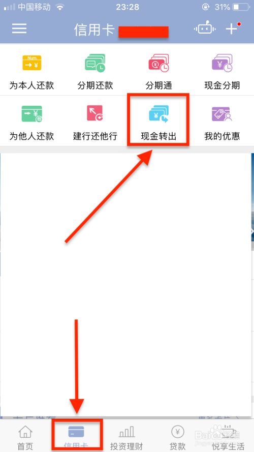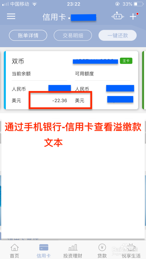 通过手机银行查看溢缴款,手机上打开手机银行APP,切换到信用卡页面,可以查看当前账户到溢缴款(通常溢缴款在信用卡中显示为负数),如下图所示。