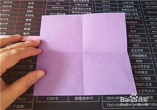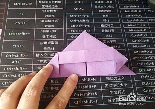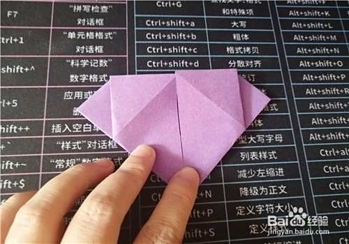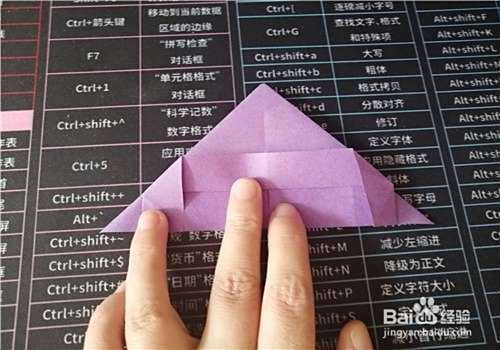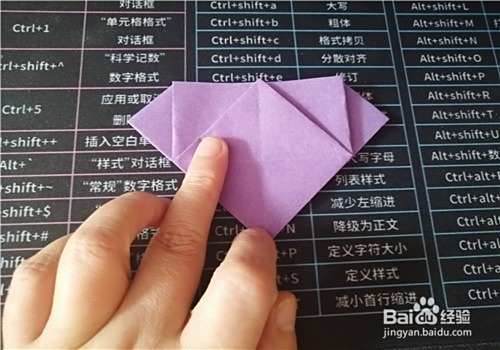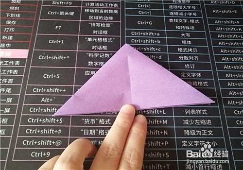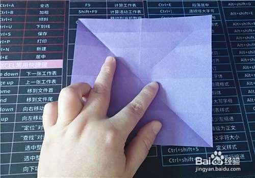 翻到背面,把对角线对折,如图一。按照折痕把彩纸折成图二的样子,再把下侧的边上折,如图三。