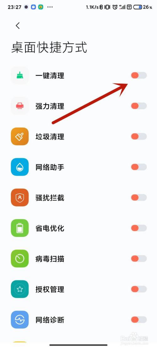 进入到桌面快捷方式后,我们可以看到很多功能快捷方式,点击右侧按钮即可添加。本例中选择添加“一键清理”,点击添加按钮。