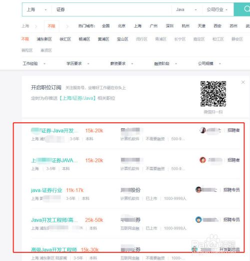 我们也可以在搜索框后边选择职业类型和公司性质,这里我们拿 java 和证券做例子