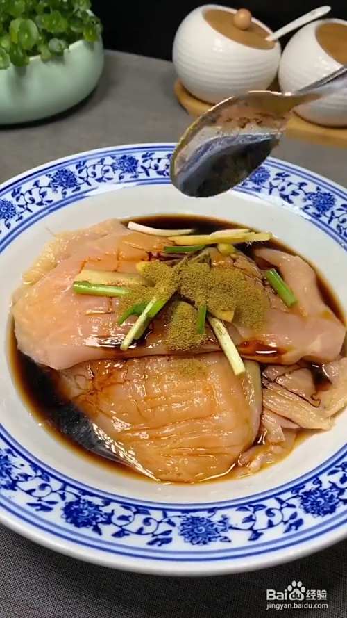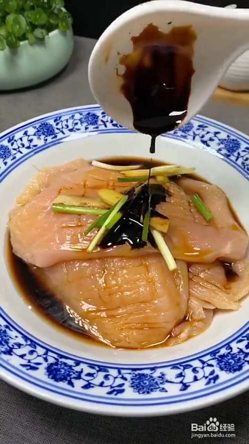 鸡胸肉从中间片开,再用刀片敲打方便入味;再放入盘中加入葱姜,料酒,生抽,老抽。