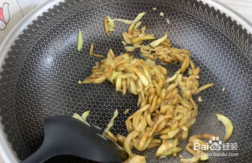 1.粉条提前用热水泡软。茄子切丝。锅中放油,油热后加入葱花煸炒。加入茄子丝。炒至变软。加入2勺酱油,翻炒均匀。