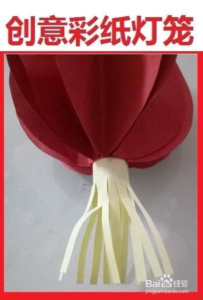 再剪一块大一些的彩纸,将它剪成许多小穗子,糟注做灯笼下的流苏。然后把它粘到灯笼管的下方,把多余的纸剪掉即可。