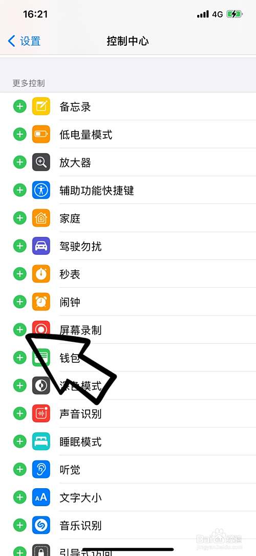 在控制中心里的更多控制里找到屏幕录制,点击前方加号,添加屏幕录制到控制中心。