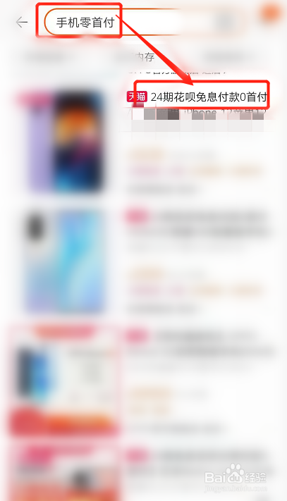 打开手机淘宝,搜索:手机零首付,下列显示0首付的手机列表,点击需要购买的商品。