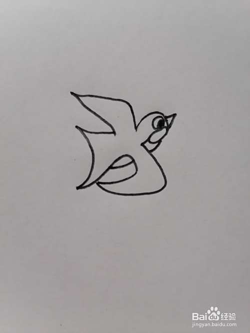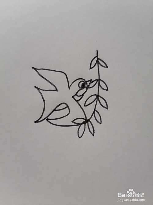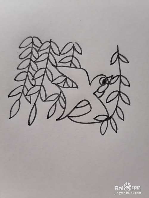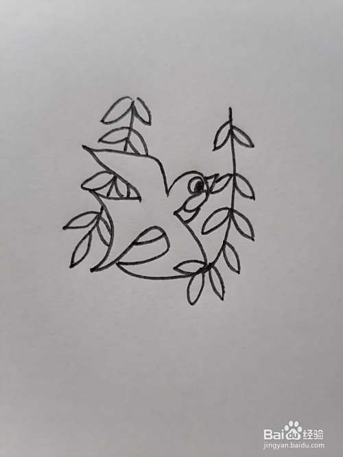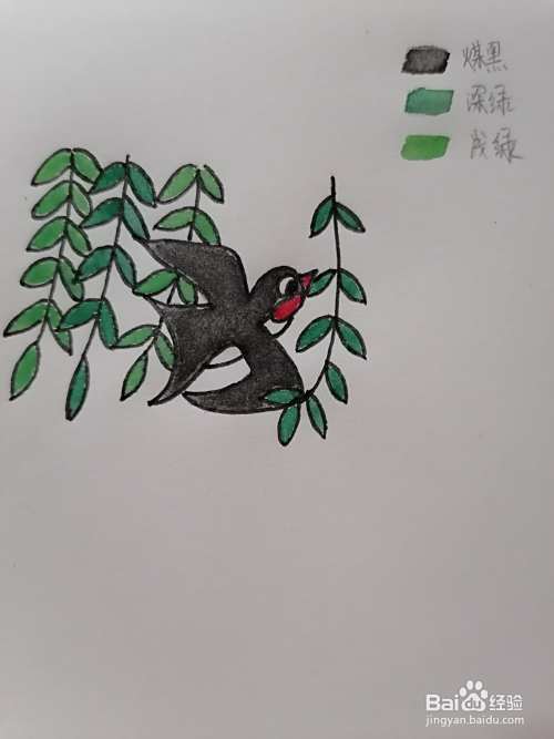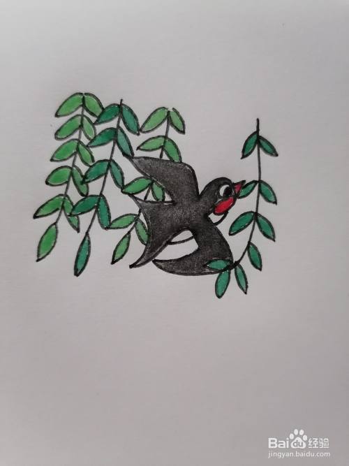 画好所有叶子,用红色水彩涂好燕子眼睛和嘴巴,用煤黑水彩涂好燕子身体