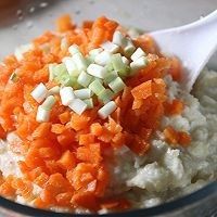 将胡萝卜,葱花(放葱白那部分)放入玉米糊中。