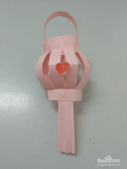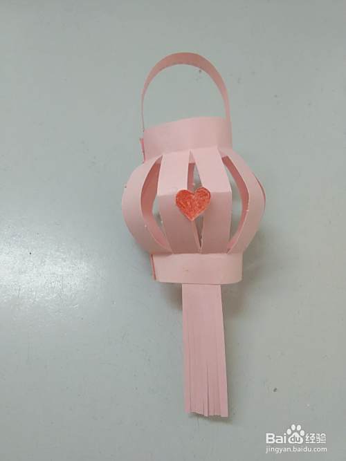 再用红笔在彩纸上画一个心形,用剪刀剪下来,抹上胶棒,粘在灯笼肚上,一个漂亮的爱心小灯笼就做好了。