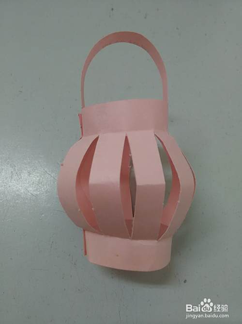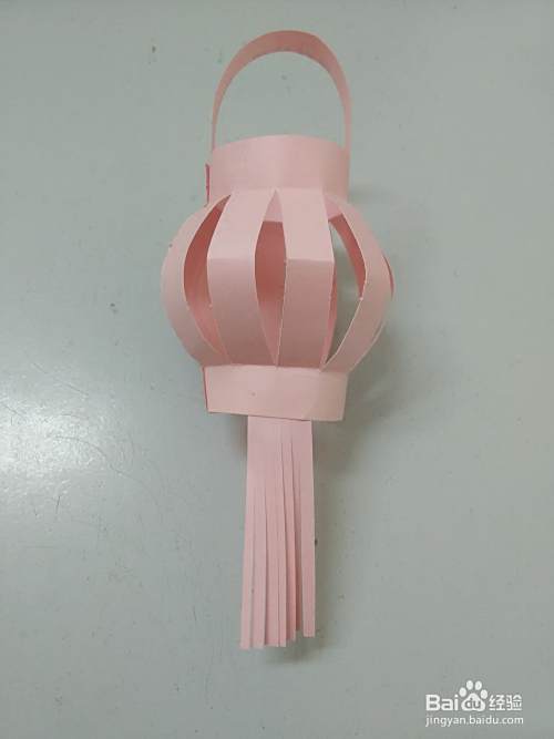 再用剪刀在彩纸上剪一个细长的小条,粘在灯笼上面,当作灯笼的提环。