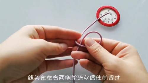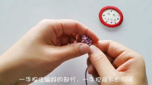 4一手捏住编好的部分,一手拉紧下面的线,拉紧。