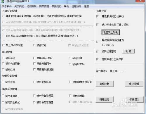 安装USB控制软件以比较知名的大势至USB监控系统(百度直接搜索“大势至USB监控软件”即可获取下载地址)为例,启动软件后如下图:
