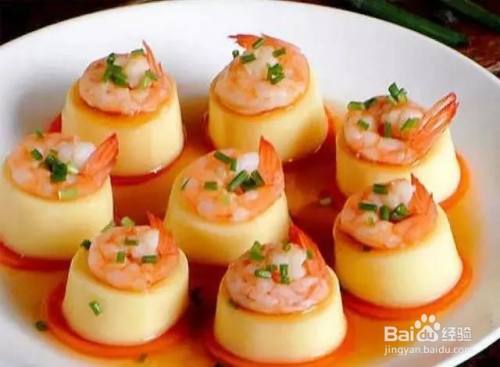 5、把玉子豆腐摆放在胡萝卜片上,放上虾仁