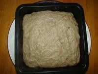 用刮铲刮平表面,平铺在烤盘上。将烤盘放入蒸锅中发酵蓬松成两倍大。为了更好地发酵,可把锅里的水烧热一下关火,给面团提供一个温湿的发酵环境。