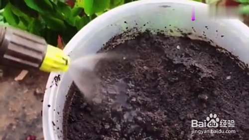 用浇水壶,在覆盖后的土壤浇上适量的清水。