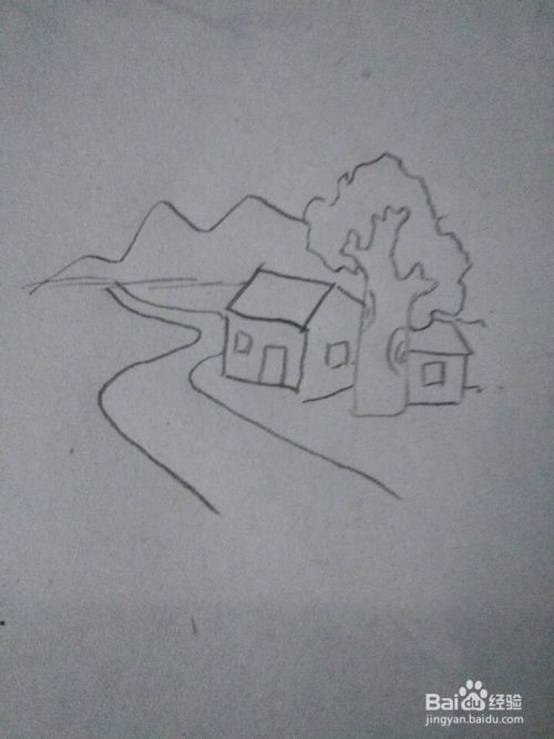 先画上一个大树的主干,因为在屋子的旁边一般都会有一些树木,先画树,再画屋,这样可以少画一些被树木遮挡的部分。