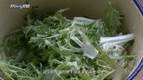 2清洗,控干水分后,将苦菊切成5cm长的小段,并放入碗内。
