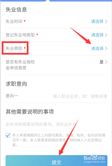 最后找到失业原因,点击【请选择】,如实选择后提交即可。