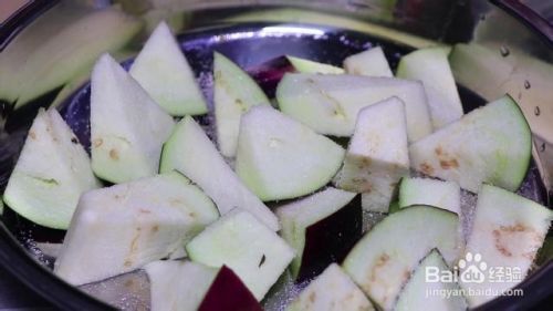 首先将茄子洗净去皮,将茄子斜切成片