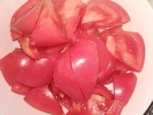将西红柿洗净去茎,切成两半,然后再将西红柿切片
