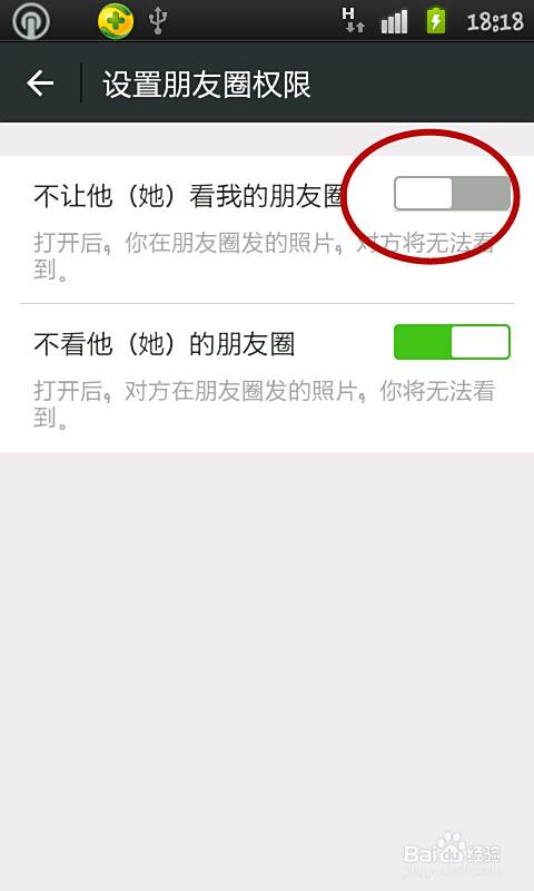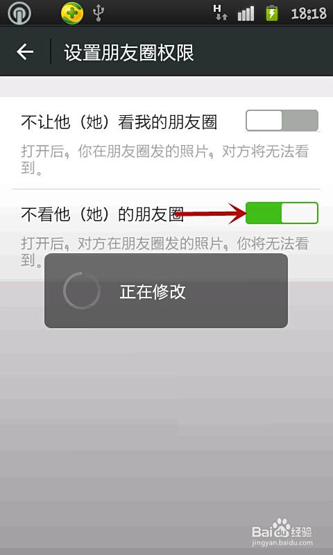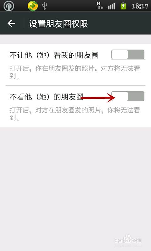 当箭头标记处变成绿色即设置完成,从此你就看不到对方在朋友圈发的照片啦