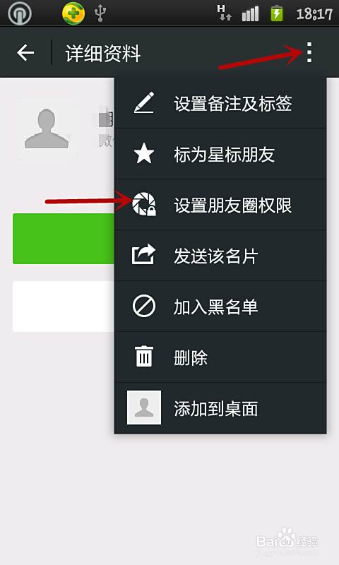 点击详细资料旁边三个点的图标,在菜单中有一个设置朋友圈权限的选项
