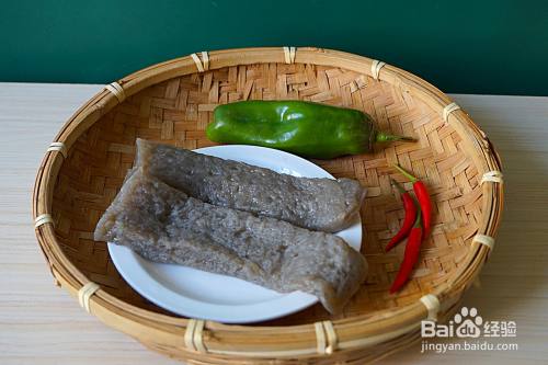先准备好山芋粉皮卷、青椒、小米辣。