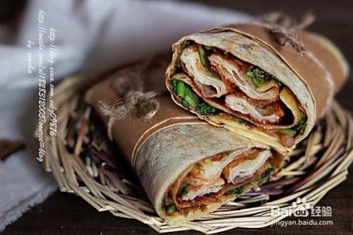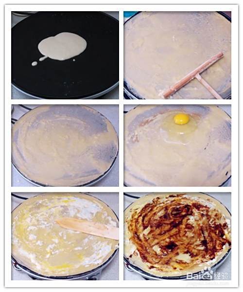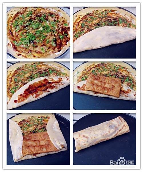 饼中夹馅:脆饼、鸡蛋、甜面酱、辣酱、榨菜、香菜等各适量