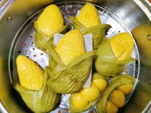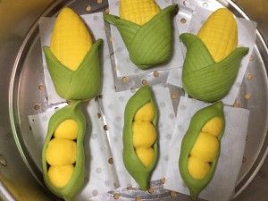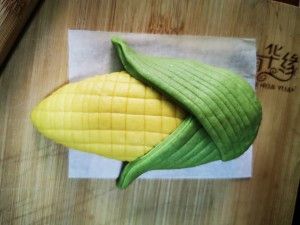 做玉米造型的馒头,先取黄色小面团擀成三角形的形状,压痕,左右两边向后捏在一起,再取绿色小面团擀成圆形,压痕,中间切开。