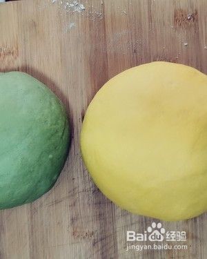 250克小麦粉加适量温水、适量细砂糖、3克发酵、果蔬粉(南瓜粉)揉成光滑的面团。250克小麦粉加适量温水、适量细砂糖、3克发酵粉、果蔬粉(菠菜粉)揉成光滑的面团。