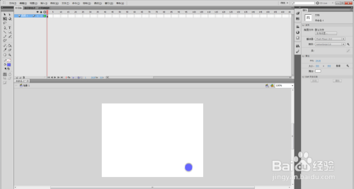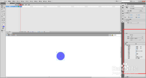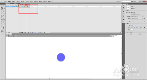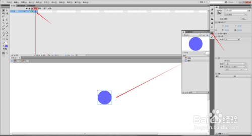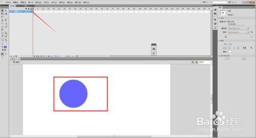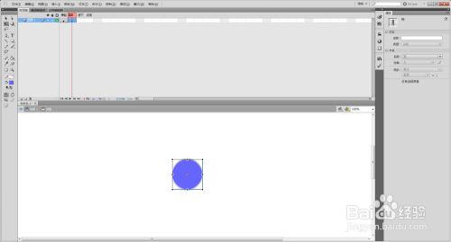 选择时间轴的第一帧中,在工具栏中选择“椭圆工具”按住shift在画布上创建一个圆形,这里我选择的紫色,将描边取消。如图。