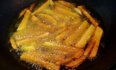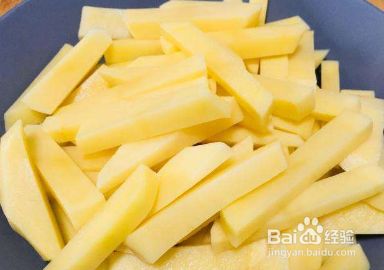 然后炸土豆条(比薯条粗点就可以了),炸干一点,为的是之后炒不容易碎。
