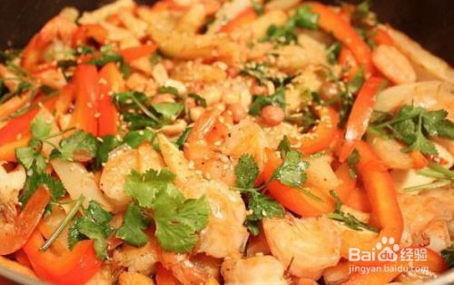 炸完土豆条,锅内的油盛出来,留大概两匙油在锅内,然后放入花椒,干辣椒段,蒜片,姜片,八角(两枚就可以了),如果有大葱段也可以,开始爆炒,炒香后,倒入黄瓜和炸好的虾,开始炒,烧给点盐,然后放入炸好的土豆条,翻炒,给少点糖(糖可以起到提味的作用,但是不要多了),然浇一圈生抽,翻炒(火不要太大了),如果可以的话,还可以放点那种炸的花生米。因为东西之前都炸过,是熟的,所以不要炒太久了。这样就好了,最后,撒上芝麻,和香菜在上面,就OK了。我这个方法是干锅的,炒出来比较干的那种:)