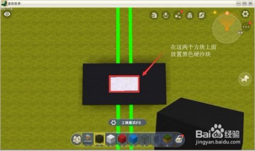 4、在这些黑色硬沙块的中间位置(如下图)放黑色硬沙块,高度为四个方块。