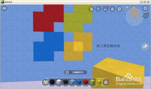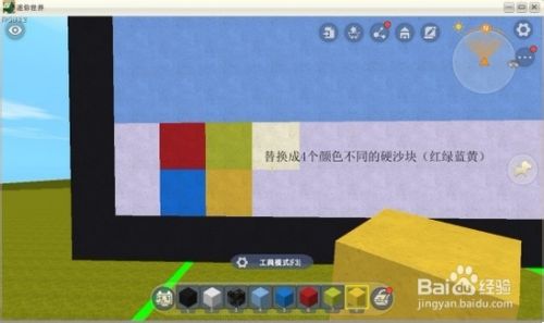 13、现在看到之前我们建造的白色横条,在下图的位置替换为四个不同颜色的硬沙块,分别是红、绿、蓝、黄硬沙块。