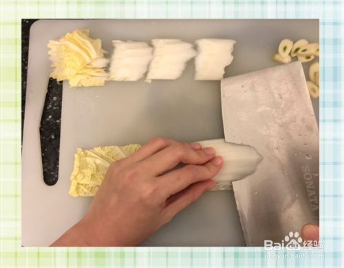 一、白菜洗净,斜刀切片。(直着切也行,斜刀切更入味)
