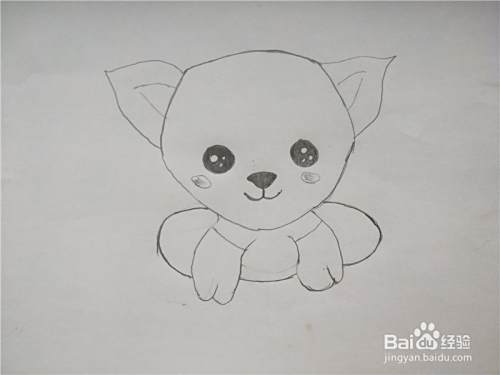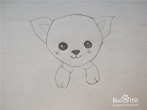 之后我们将茶杯犬的五官画好,眼睛要画的大一点这样会更可爱,嘴巴按照如图的样式去画即可,鼻子大家可以根据自己的喜好画成线条样式,如图所示。
