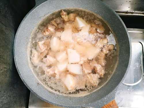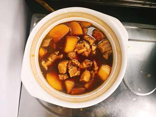 8把炒过的牛腩萝卜和酱汁倒入砂锅内,加入适量开水,加入适量生抽。小火慢炖,炖到牛腩软烂。这步也可以把材料倒进压力锅煮也可以。