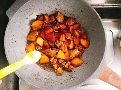 6把牛腩,萝卜倒入锅里,翻炒均匀,让牛腩和萝卜都裹上一层酱汁。