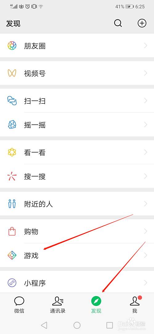 第一步,打开微信app,切换到‘发现’导航栏,点击‘游戏’菜单栏,如下图所示: