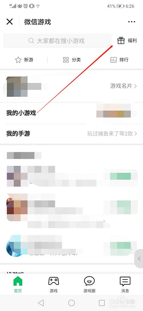 第二步,在‘微信游戏’页面上,在页面上的右上方找到‘福利’按钮,如下图所示: